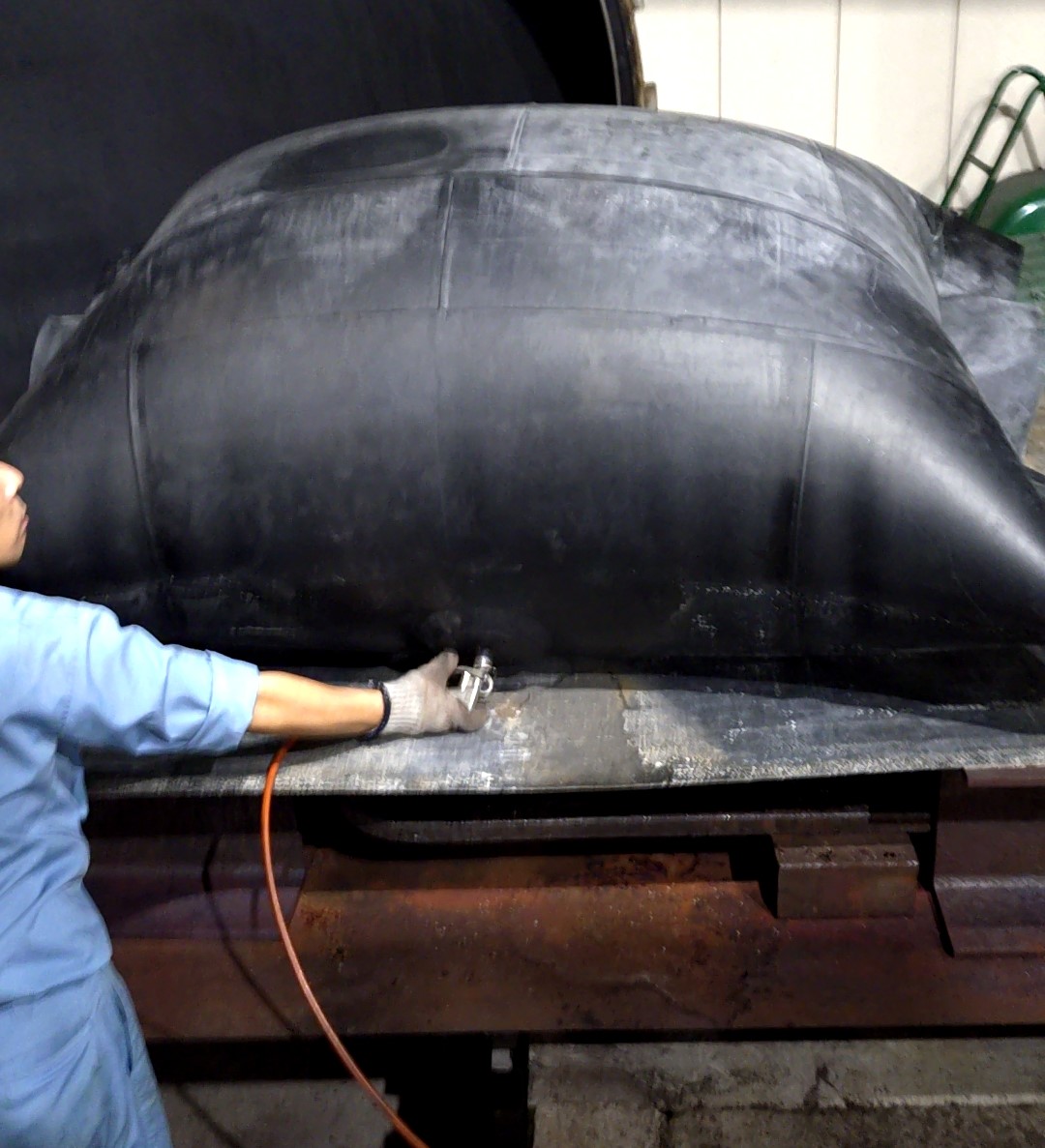 予算も限られている為、金型を作らずに未加硫ゴムを加硫接着しゴム袋を製作。